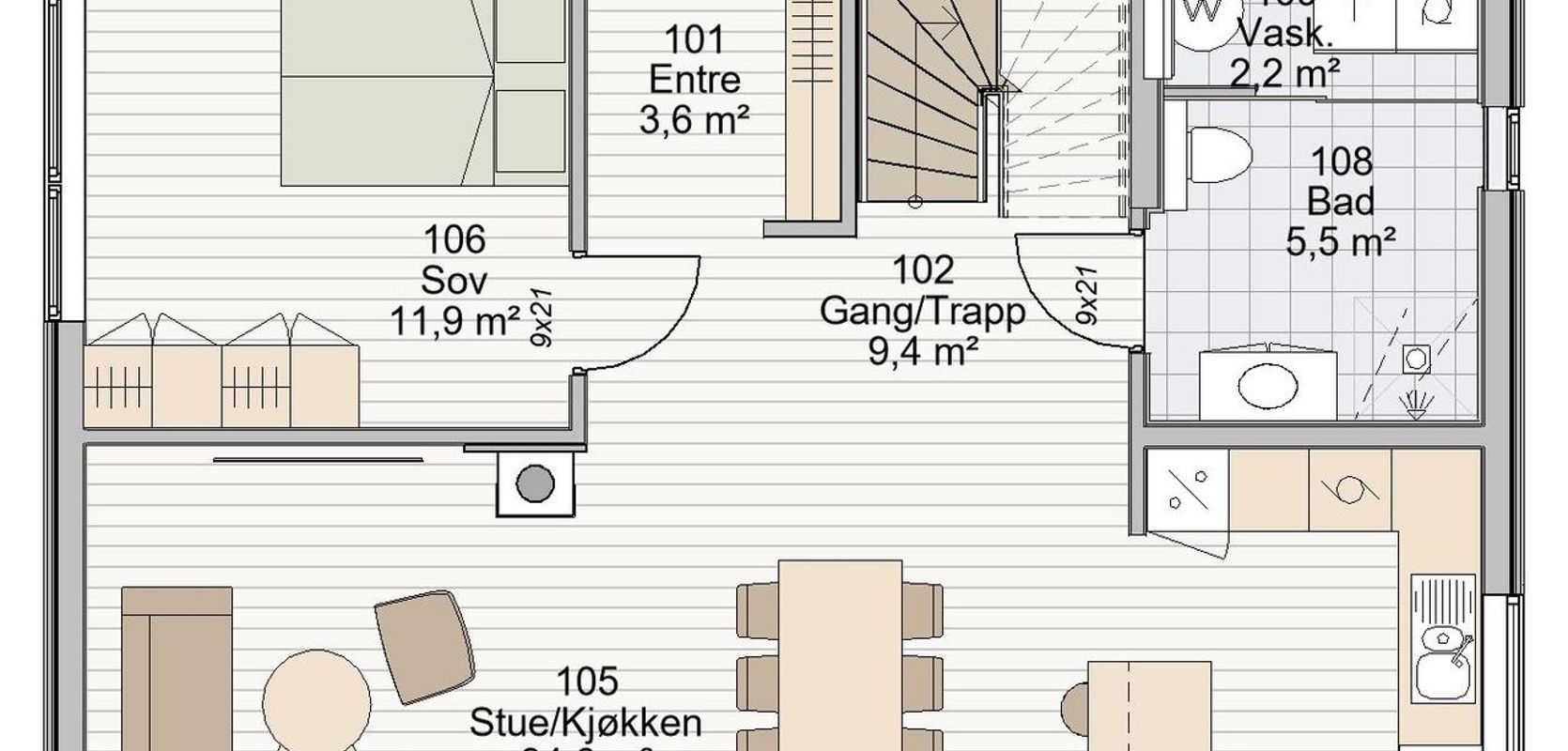 Oppholdsrommet er luftig og innbydende, med soner som gjør det enkelt å kombinere avslapning og sosiale sammenkomster. Store vinduer sørger for rikelig med naturlig lys, og gir en herlig forbindelse mellom inne- og uterom. Den overbygde terrassen og balkongen inviterer til hyggelige sommerkvelder med familie og venner, hvor du virkelig kan nyte omgivelsene.
