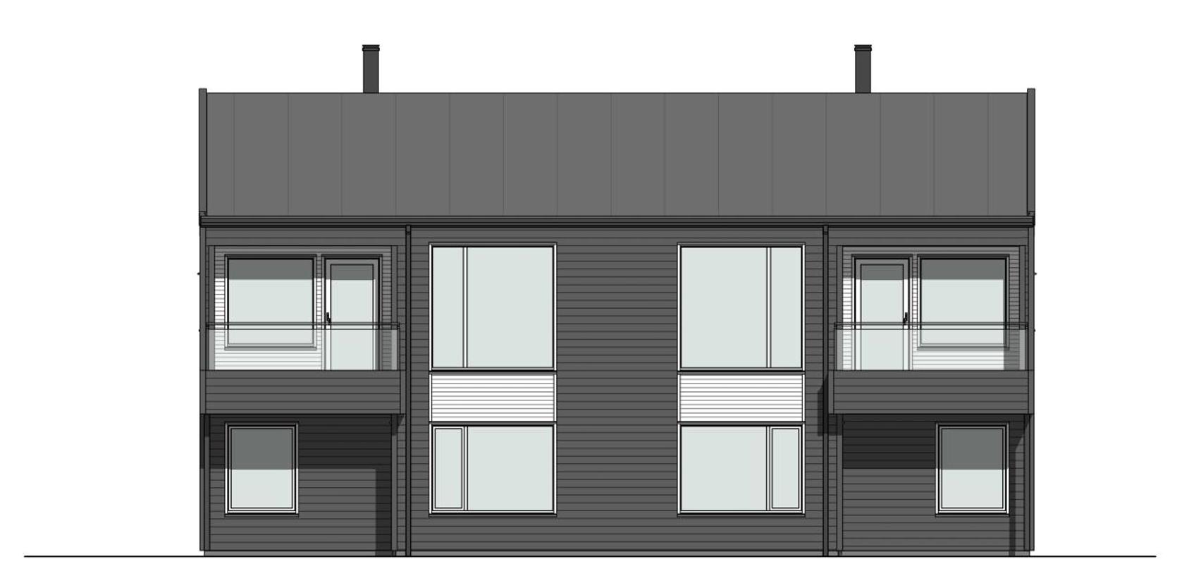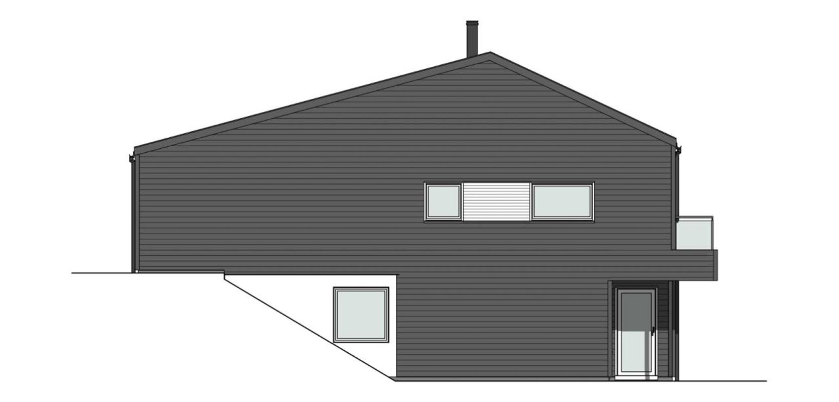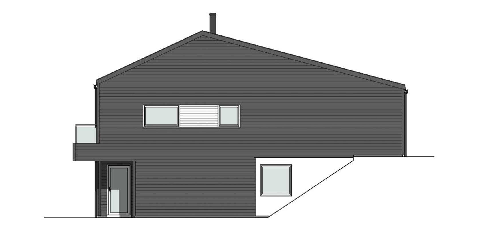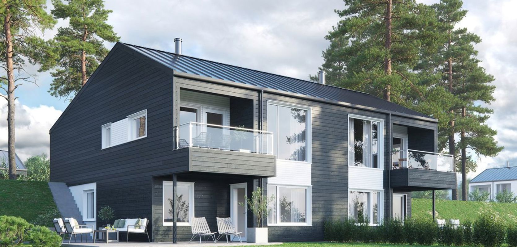Oppdag Vågen - en tomannsbolig tilpasset for skrå tomt. Boenhetener er speilvendte og har skjermede balkonger på hver side.