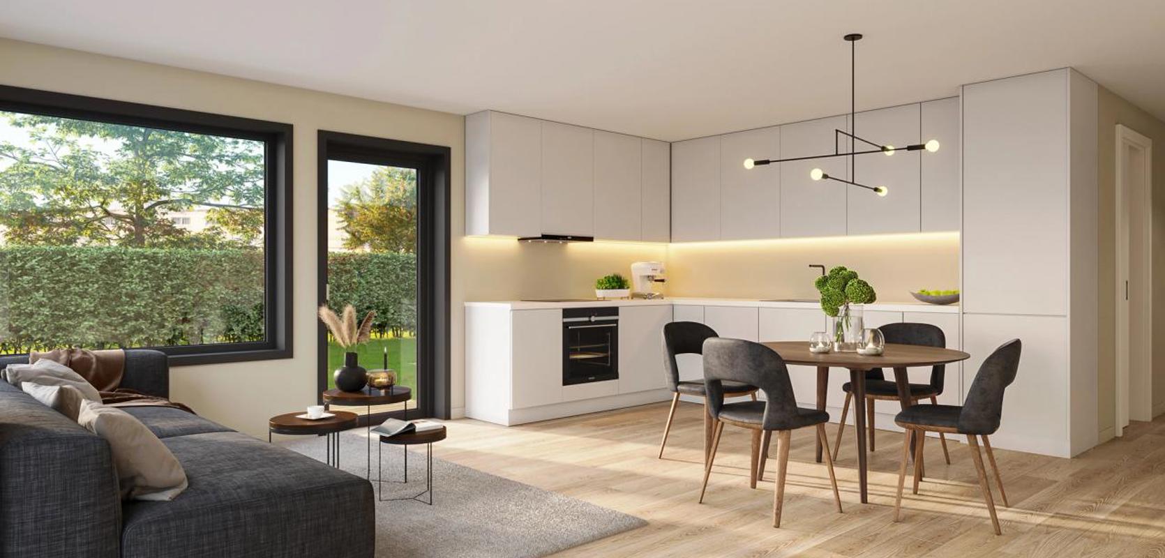 Planløsningen er åpen og praktisk, med naturlige soner for både samvær og hvile. Kjøkken og stue er samlet i ett sosialt hjerterom med godt lysinnslipp og enkel tilgang til uteplass. Her er det rom for å samle hele familien – eller bare nyte en stille morgen med kaffekoppen.