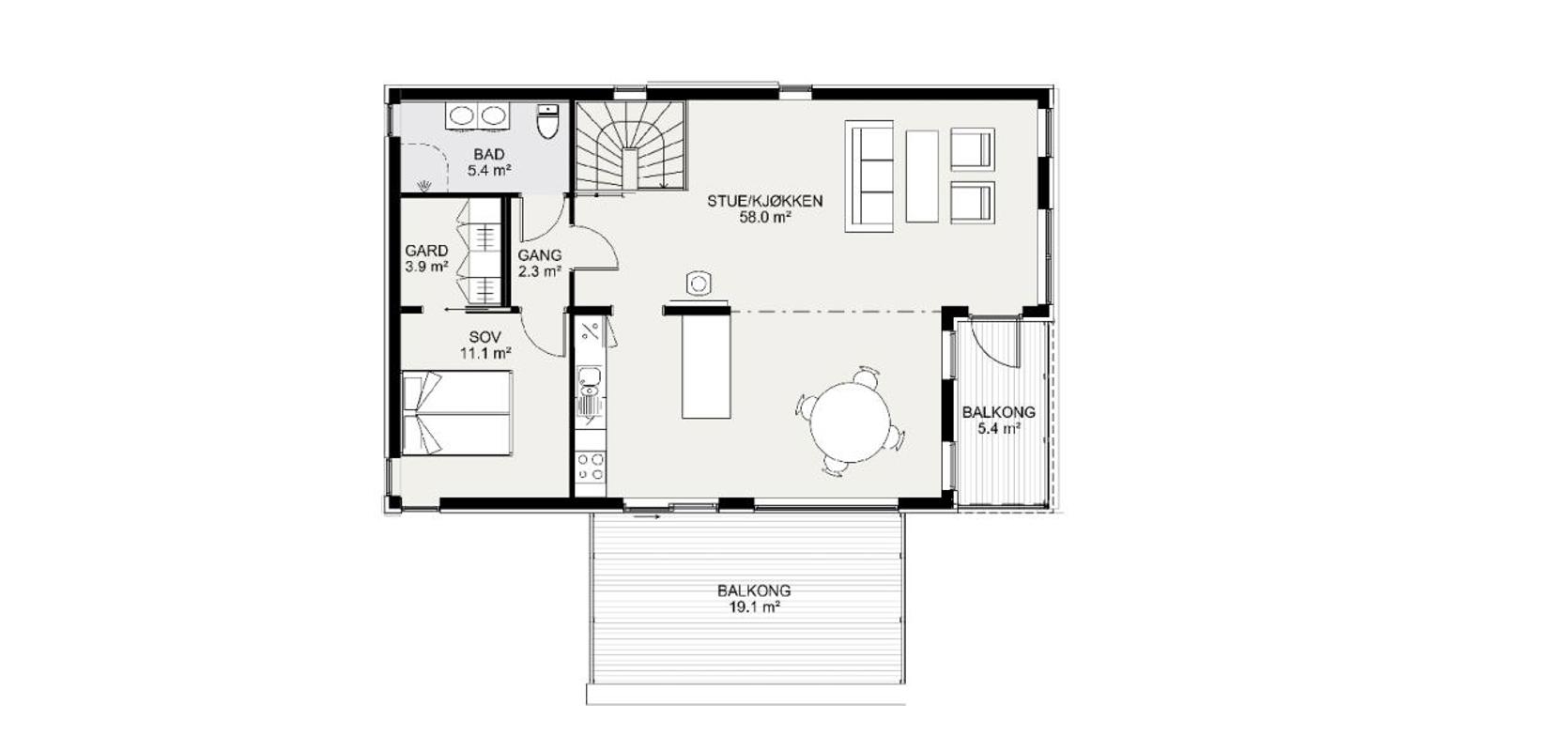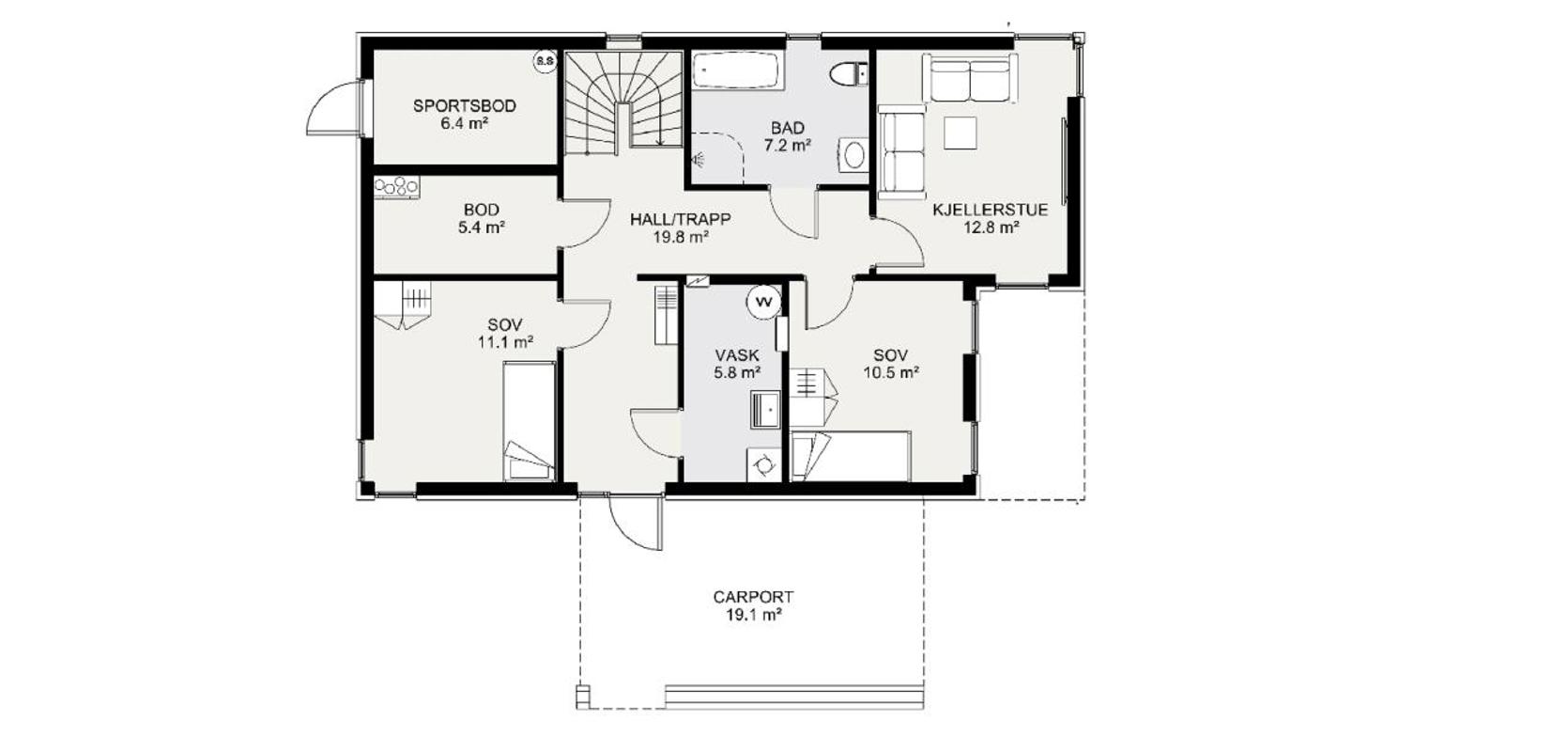 Inkludert er egen carport, tre komfortable soverom, to balkonger, en innbydende åpen stue- og kjøkkenløsning, to bad og separat vaskerom. Boligen er tilpasset flat tomt, og kan også kjedes for større feltutbygginger.